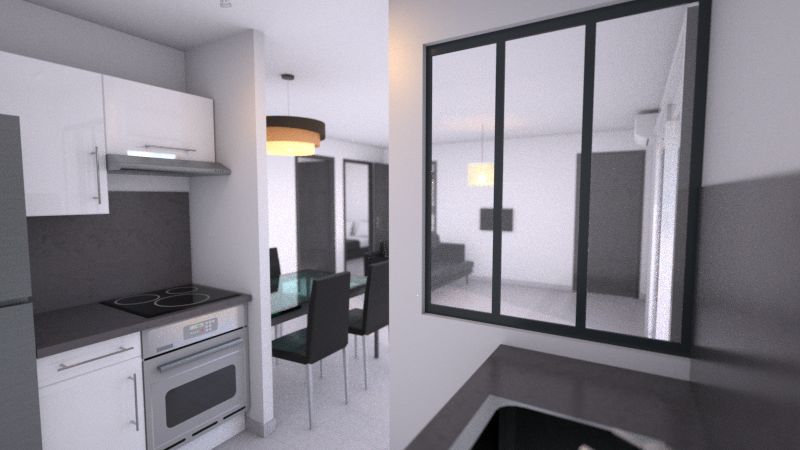 - 1 cuisine aménagée et équipée de meubles bas, meubles hauts, plan de travail, crédence assortie au plan de travail, évier et mitigeur, four électrique encastré, plaque de cuisson à induction ou vitro-céramique, hotte à charbons actifs,